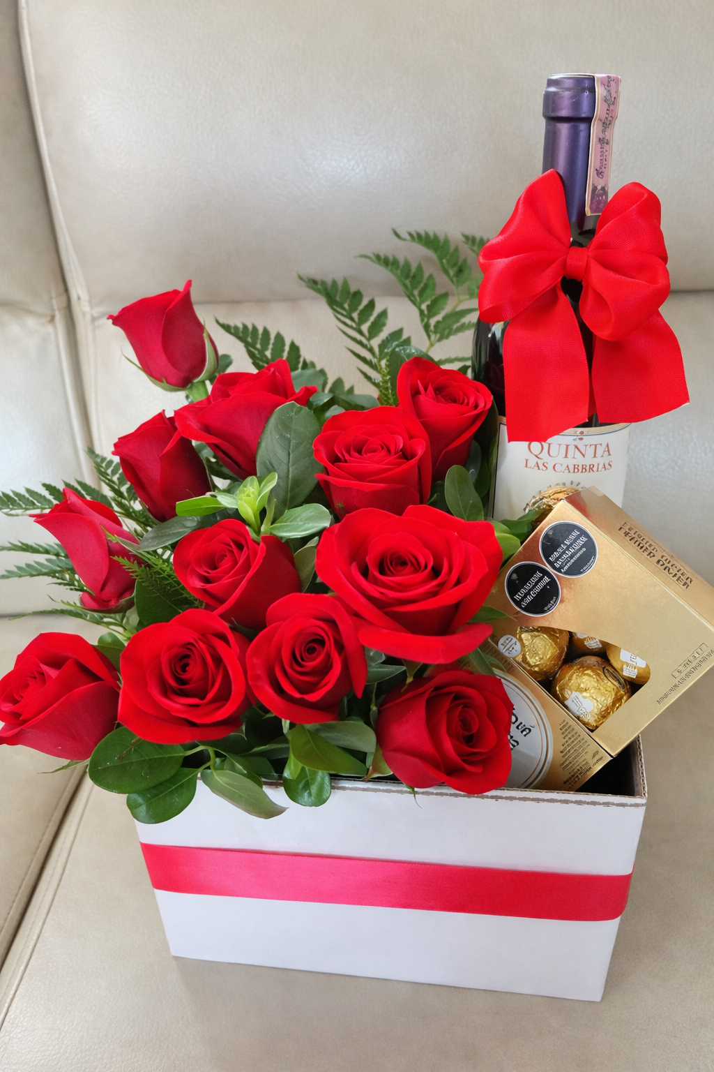 Caja por 12 rosas, ferrero x 8 unidades y botella de vino R134